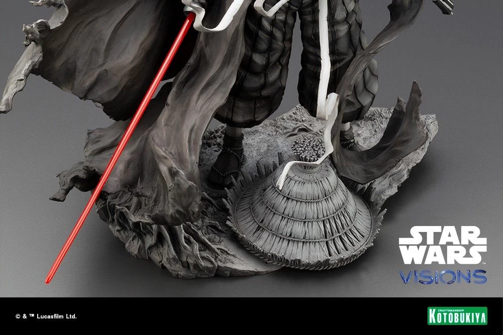 Masterfully sculpted in 1/7 scale the Ronin stands in a stoic pose brandishing a lightsaber aglow with vibrant red from the imbedded Kyber Crystal™. Every detail from the Ronin’s character design has been painstakingly replicated down to the prosthetic jaw support, his arsenal of two lightsabers and blaster and the billowing robes of his attire, which were designed to resemble those of a kimono in Japanese culture.