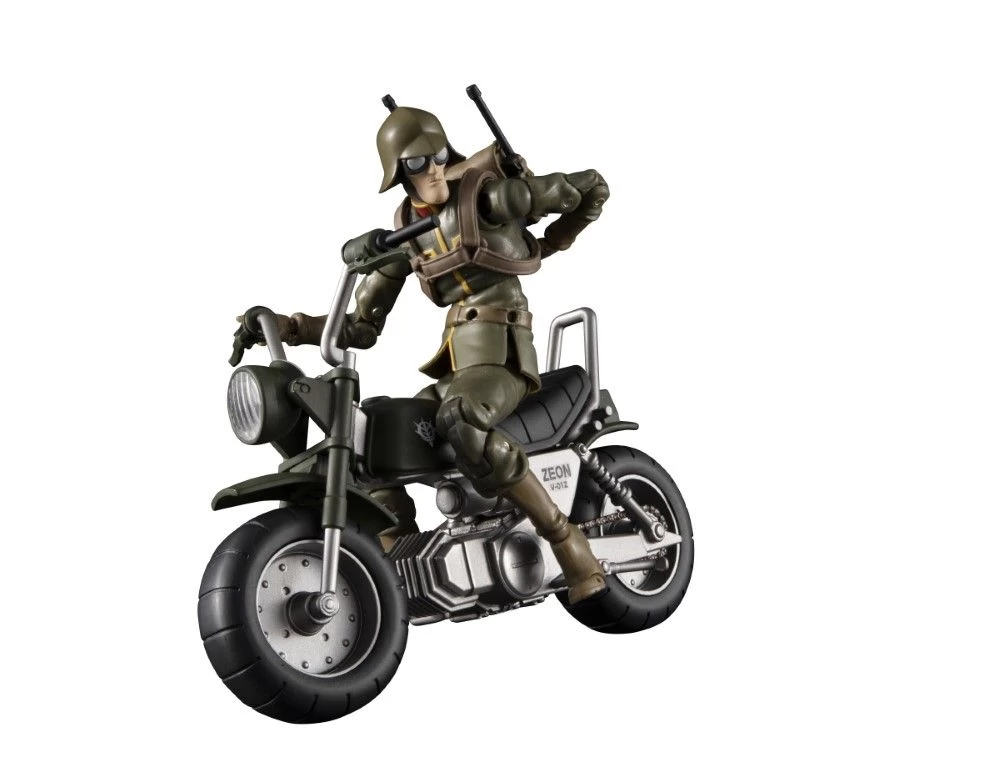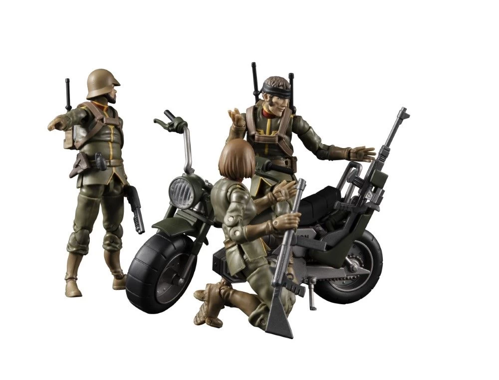 Introducing a new G.M.G (Gundam Military Generation)” set from the Ramba Ral Corps! The “08V-SP” is a precolored finished figure set of a solider and a motorcycle! The other optional head comes with a bandana-wrapped around it and parts that can reproduce the look of Zeigan from Ramba Ral’s group. This set also comes with several weapons and accessories: A Navan 62 type pistol, a formal shotgun, a communication set, a harness, a pistol holder,
