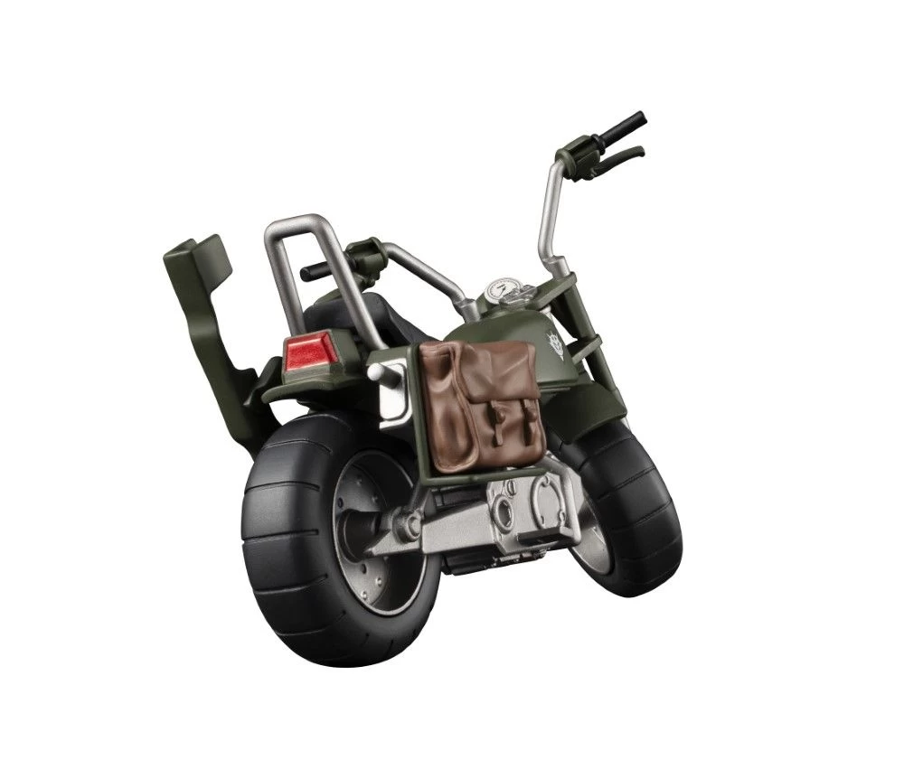 The bike is 1/18 scale to be in line with G.M.G figures. The bike’s front and rear wheels rotate along with withthe front wheel being able to turn left and right. Accessories include a saddle bag and a stay for the