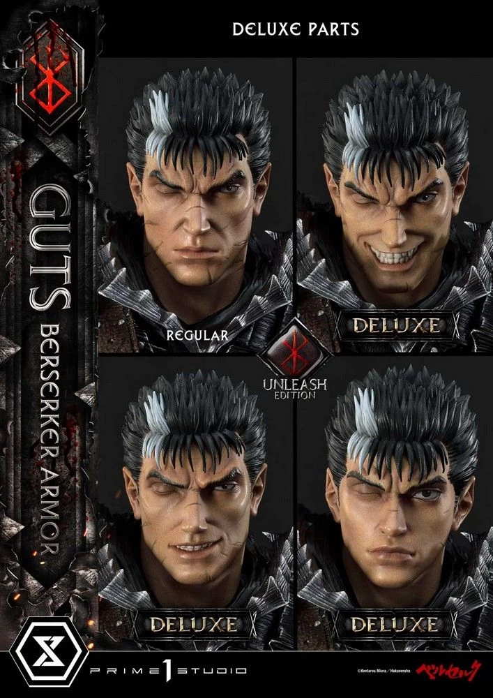 In addition to Guts’ standard portrait, the Deluxe Version Guts comes with three other swappable heads, to give him the flexibility of expression: from sneering confidence to outright malice! And most especially, we have included a rare, one-of-a-kind Guts portrait, drawn by Miura-Sensei, gifted to us, and sculpted by Prime 1 Studio artists with the utmost reverence and care. This unique, exclusive Miura-Sensei swappable head can be yours with the purchase of the Deluxe Version!