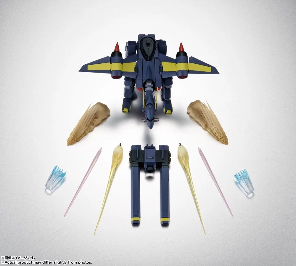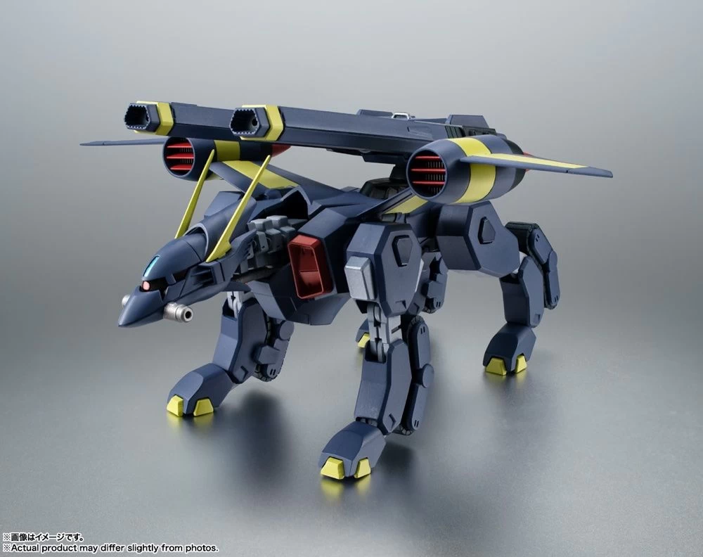 Transforms from quadrupedal mobile suit to cruising mode. Includes numerous effects, such as sand clouds, gun blasts, and thrusters! Also accommodates the missile pods from the Zodiac Alliance of Freedom Treaty weapon set (sold separately).