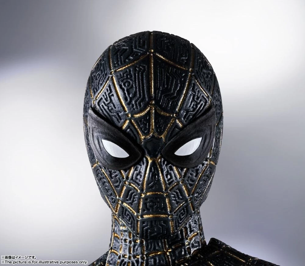 The black and gold suit from the upcoming film “SPIDER-MAN: No Way Home” joins S.H.Figuarts! Includes numerous accessories for incredible play value! [Set Contents] Main Body, Three pairs of optional hands, Spider web (for grabbing), Spider web (for shooting: two long, two short), Optional head, Two pairs of optional eye parts, Optional neck part, Web shooter, Magic web, Chest magic parts, Tamashii STAGE connector joint, Stand, Magnet joint, Auxiliary parts for eye replacement.