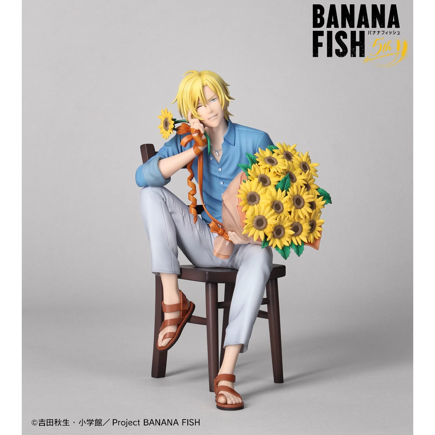 From Union Creative. Commemorate the 5th anniversary of the broadcast of the TV anime Banana Fish with this figure of Ash Lynx! Based on his birthday illustration, this figure features Ash seated in a chair holding a huge bouquet of sunflowers with a relaxed smile on his face. He can be displayed sitting in various places and measures about 7″ tall.